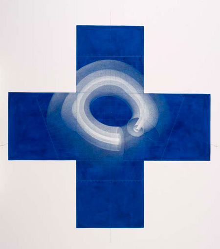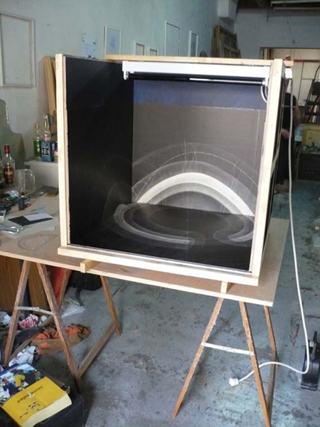 Sur les 5 faces visibles à l'intérieur d'un cube entièrement noir, sont dessinées des anamorphoses de formes topologiques.