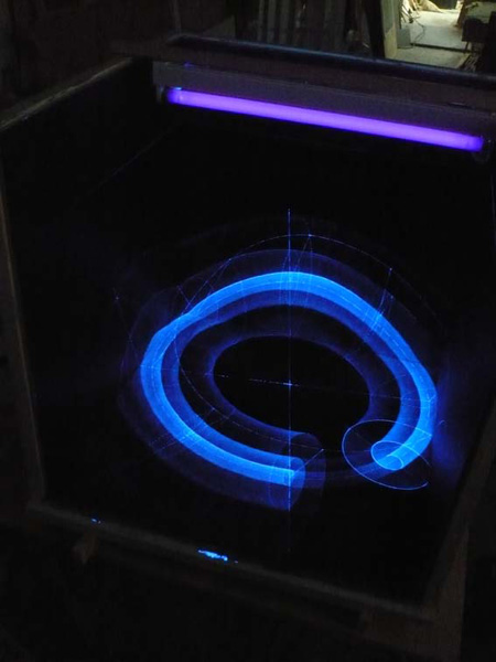 Ces formes sont dessinées par grattage sur de la carte noire et donc apparaissent en blanc par l'éclairage lumière noire.