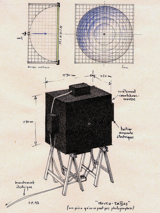 A black half-cube totally sealed and covered with foam rubber, containing a scale model in white cardboard cut into a half-sphere. A play of mirrors and a peephole allows one to perceive almost all of the sphere’s interior.