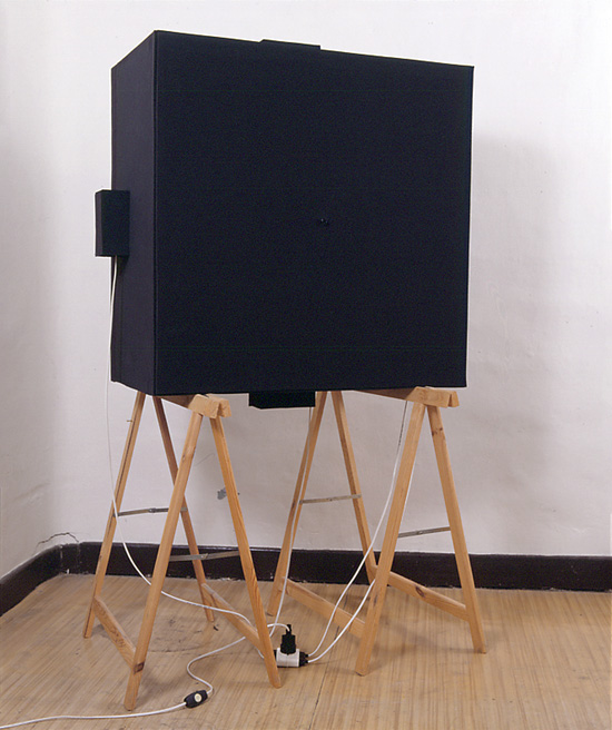Cardboard, wood, metal, mirrors, rubber, optical system, lightbulbs, 165 x 58 x 90 cm