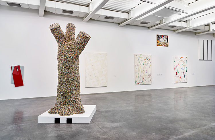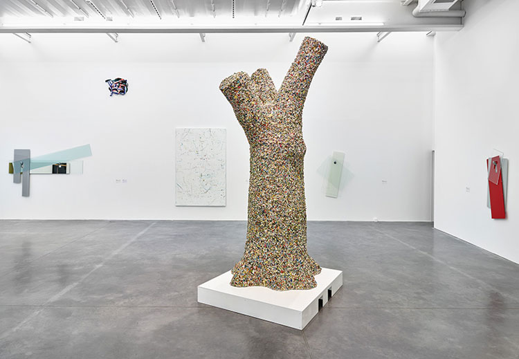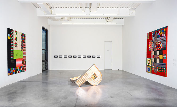 Cette traversée d’un moment de l’oeuvre de l’artiste rend sensible la dynamique créatrice d’une quête en mouvement constant et met au jour les ressorts qui l’animent. La recherche se révèle hyperactive, l’éclectisme de l’oeuvre en témoigne. Faisant feu de tout bois, l’artiste est un collectionneur invétéré d’objets trouvés et de matériaux hétéroclites – tissus imprimés, autocollants, fèves de galettes, tapis, lingettes de machine à laver. Qui plus est, des activités liées à des métiers divers, broderie, carrosserie, couture ou ferronnerie, participent de ses pièces, leur réalisation pouvant être déléguée à un tiers.