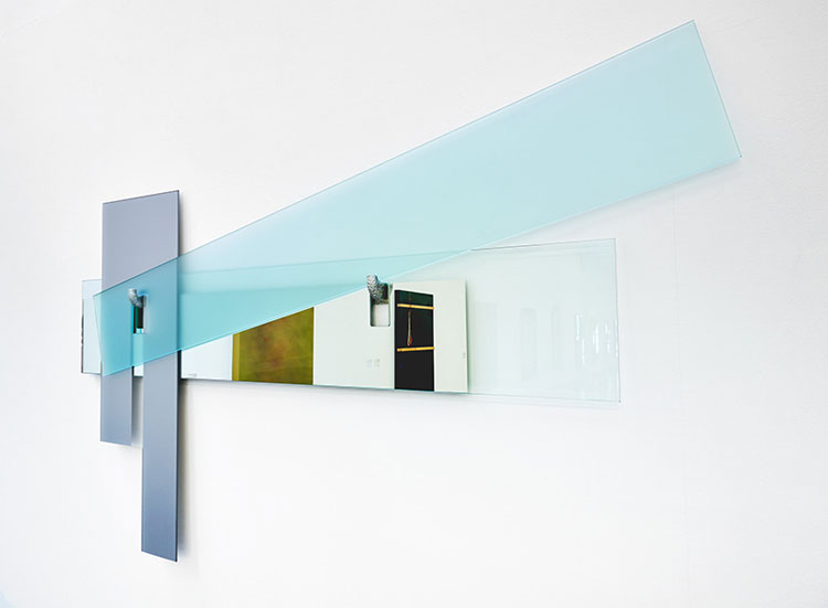 Verre extra-blanc, argenture, peinture métallisée, acier zingué, caoutchouc, 248 x 158 x 9 cm |
