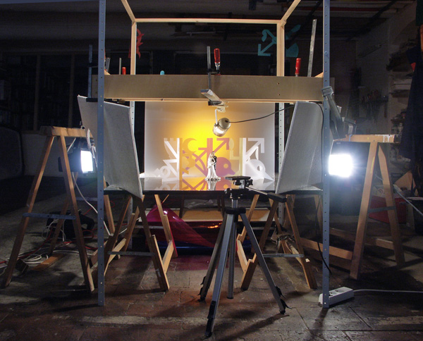 La maquette d'un dispositif de prise de vue a été conçue à l'échelle de figurines de mariés. Les éléments de l'alphabet ont été découpés dans des feuilles de plastique coloré et mis en situation avec les sujets afin de tester des lumières, des positions de corps dans un espace de signes.