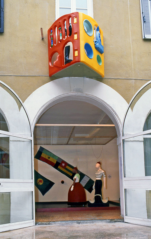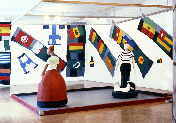 Santons tamponneurs de Philippe Guillotel (premier plan) et Drapeaux de Tom (fond)