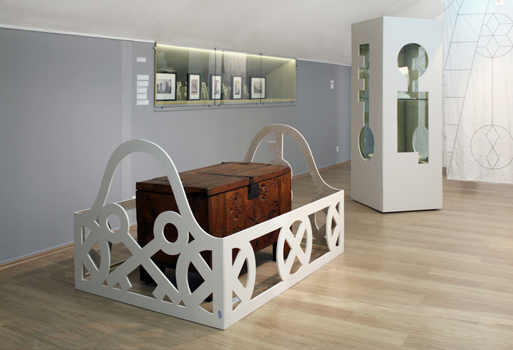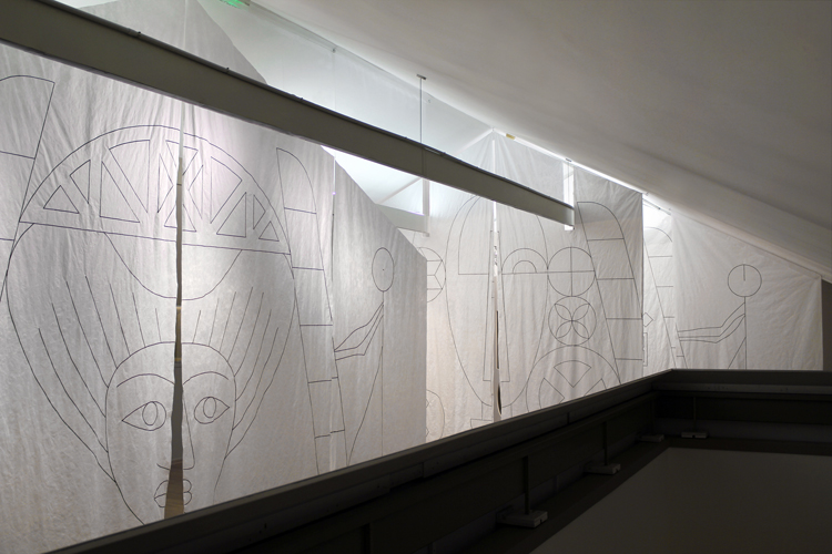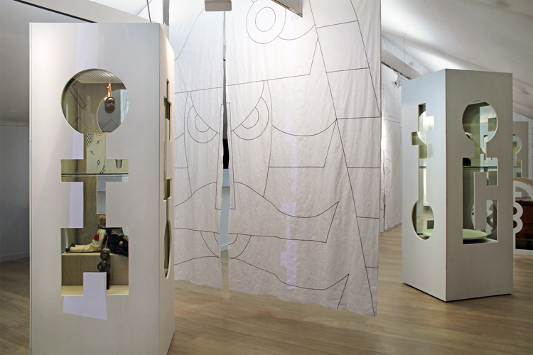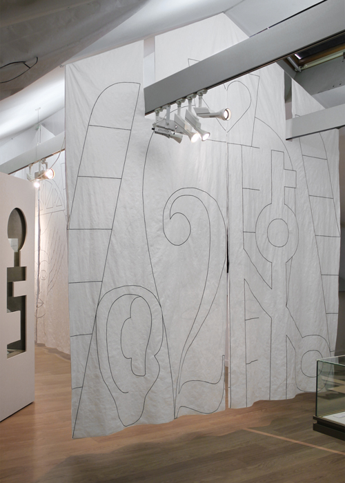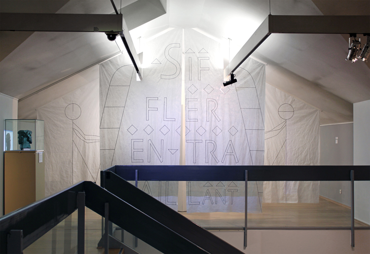 Vide, entièrement tournée vers l’extérieur, elle dialoguait avec le Mausolée du Duc de Lesdiguières, monument du XVIe siècle et résonnait avec un grand nombre d’autres objets, moins solennels, de la collection. Notre travail, comme la vie, est une sédimentation : de gestes, d’images, de récits multiples, qu’un environnement aussi riche ne pouvait que nourrir. De fil en aiguille, s’est tramée cette intrigue qu’est Siffler en travaillant, faite de bribes, d’interprétations d’œuvres qui nous accompagnent depuis longtemps ou de rencontres faites sur place… Nous y avons retrouvé les fantômes de Victor Brauner et sa femme, réfugiés non loin de Gap entre 1942 et 45, Hannah Höch, ses poupées et la Mechanischer Kopf de Raoul Hausmann qu’elle avait enfouie dans son jardin, Arp et Taueber ou le Facteur Cheval… Mais nous y avons aussi découvert ou redécouvert ces statuettes de bois, poupées Jacou du Queyras, les rosaces taillées au couteau des coffres familiaux, les animaux taxidermisés et bien d’autres encore. S’est alors construit avec et autour de quelques uns de ces personnages une architecture à la fois enveloppe et demeure, un décor constitué de rideaux brodés à traverser, de vitrines transformées en lanternes, de collections à voir par des trous de serrures…