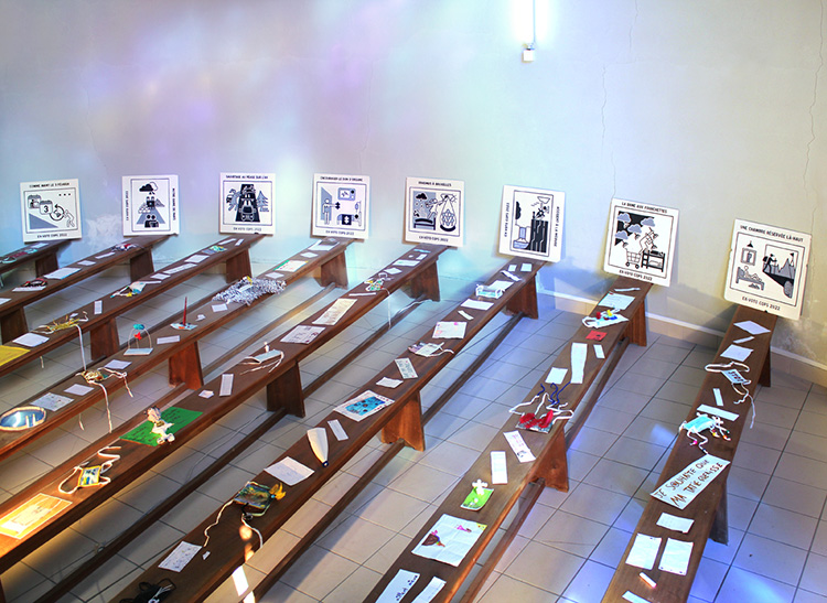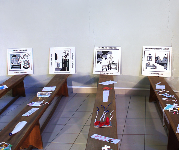 | Vue de l’exposition, détail des ex-voto Erasmus à Bruxelles, Accident à la Méouge, La Dame aux Fourchettes et Une chambre réservée là-haut, 2022 |