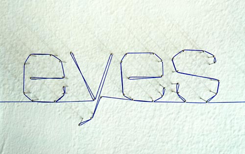 Épingles argentines, fil bleu, néons, textes