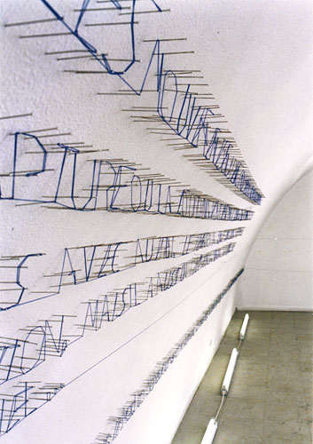 Deux citations écrites avec de longues épingles argentines et un fil marine bleu. Textes d’Alain Berthoz Le sens du mouvement et d‘ Oliver Sacks An Anthropologist on Mars. Les textes français sont écrits en lettres majuscules et en bloc. Les textes anglais sont écrits en lettres minuscules et sur une seule ligne.