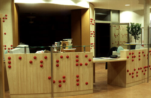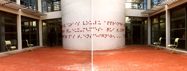 En agrandissant l’écriture braille et en se servant de formes moulées en caoutchouc rouge, nous avons donné un aspect visuel et plastique à cette écriture qui est reconnue tout en étant méconnue. Quelques plaques sur lesquelles l’alphabet braille est écrit sont mises à la disposition du public de façon à ce qu’ils puissent déchiffrer le texte. La citation est tirée du livre Siddhartha. Cette citation est composée de deux phrases : une question et une réponse. La réponse est écrite sur le comptoir d’accueil. La question, sur trois lignes, commence sur la partie droite du mur arrondi pour continuer à l’extérieur dans le patio et finit sur l’extrémité gauche.