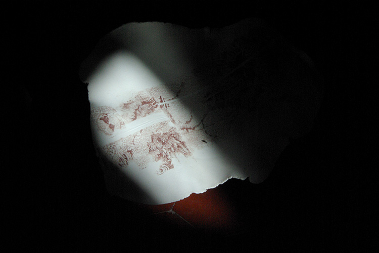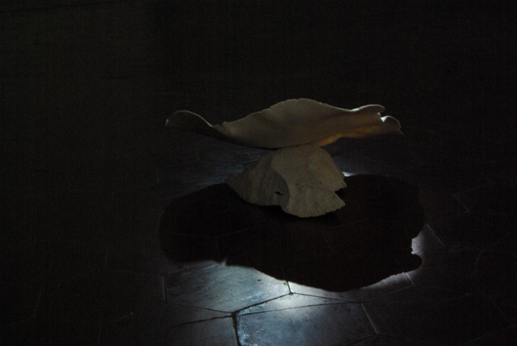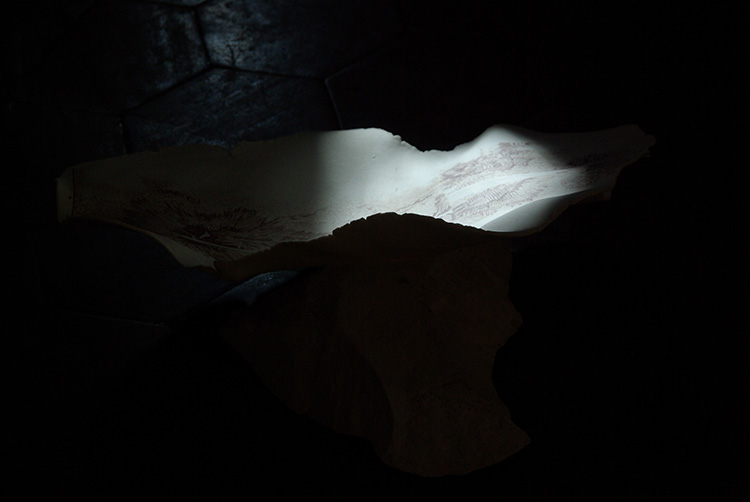 Pour cette exposition, a été créée une installation commune née d’une collaboration entre Todèl et Kevin Cardesa : le radiohéliographe pour filaments solaires. Cette pièce est à découvrir dans le portfolio du duo Todèl ici. À titre personnel, j’ai également proposé une sculpture : un Témoin solaire. Elaborée à partir d’une gravure d’une tâche solaire observée au XIXe siècle, cette sculpture est révélée par le soleil venant la balayer à 14 heures, lorsque le Centre d’Art ouvre, grâce à un renvoi de lumière provenant de la fenêtre. Le reste de l'exposition est plongé dans la pénombre et les oeuvres s'activent au fil du temps, au gré de la lumière extérieure. |