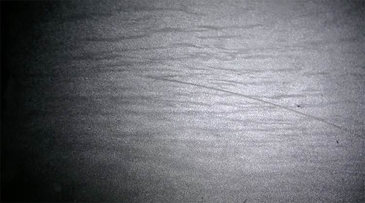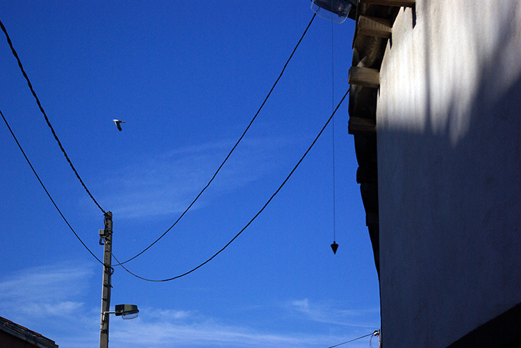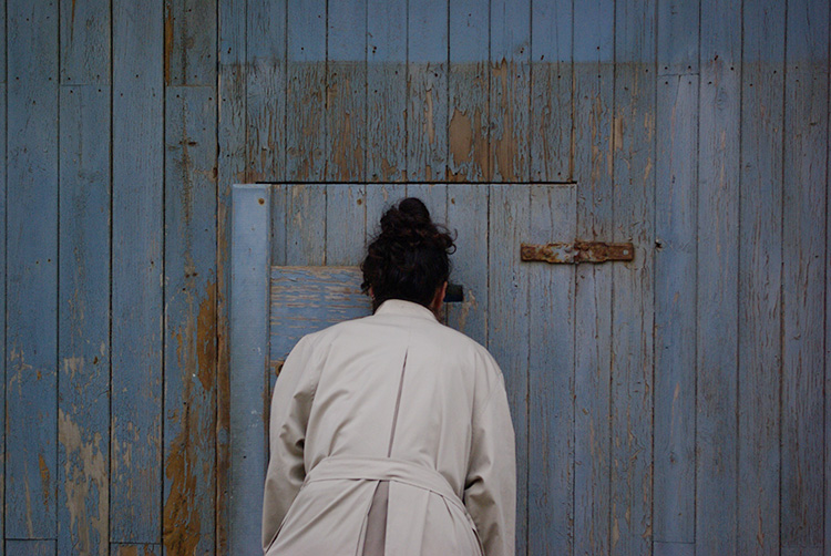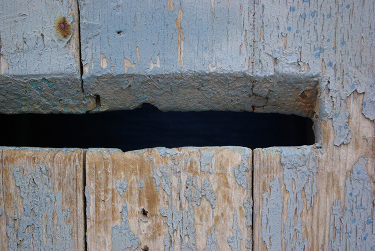 3/ En progressant dans la rue vers le second bâtiment d’un bleu délavé, une fenêtre horizontale se découpe dans la porte en bois, où l’on peut glisser son regard. Une danse aquatile s’y révèle : un détail capté en marée basse, au plus proche de l’eau, se soulève.