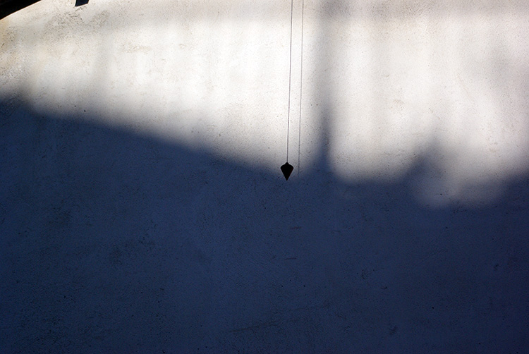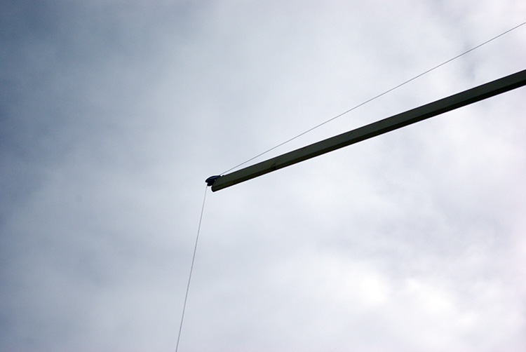 1/ En arrivant au chantier naval Borg, l’espace du ciel se dessine. Une ligne verticale surgit face à nous, tendue sur le toit, mouvante, en tension, prenant sa force dans le ressac des vagues et des marées. Cette passerelle aérienne s’équilibre des deux côtés, balancier plongeant au niveau zéro de la mer, pris dans une résistance physique. Au sol, au centre de la rue, vers la porte principale du chantier, une trace circulaire indique un emplacement privilégié pour découvrir cette installation, prenant comme point de repère les fils électriques quadrillant le ciel, dont un en particulier que le poids suspendu à la ligne verticale traverse lorsque le vent souffle à 30 km/h par marée basse - soit une force moyenne à l’échelle de ce lieu.