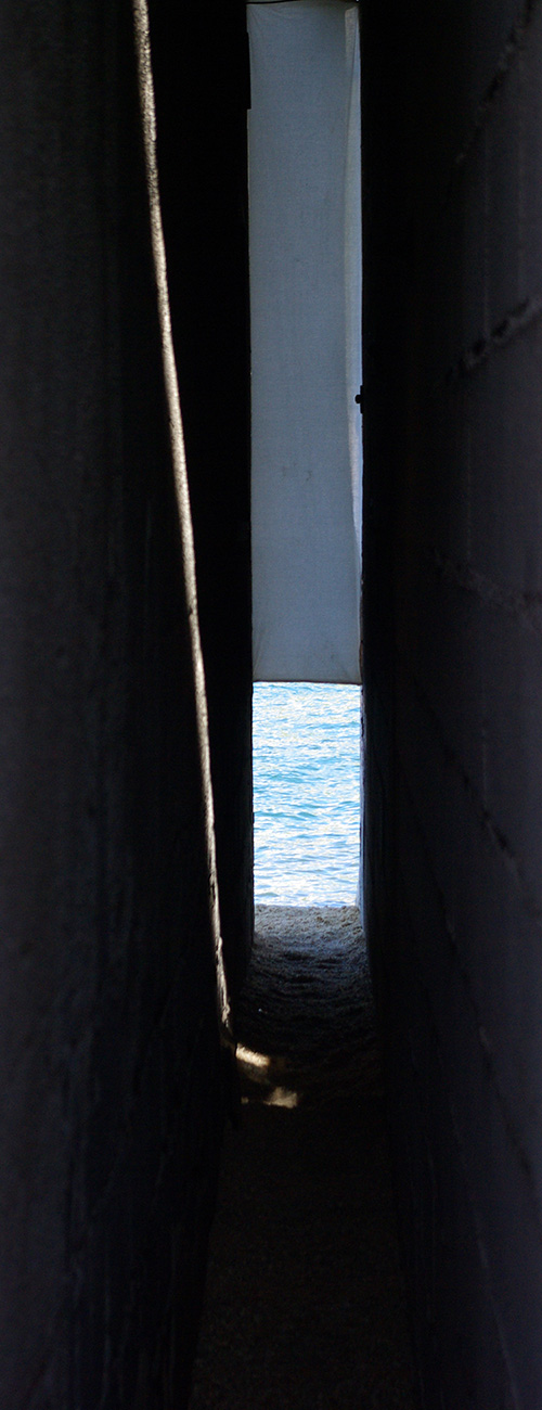 2/ À la jonction entre terre et mer, une traverse de 35 cm sépare le couple de bâtiments du chantier naval. Un espace invisible, encombré, entravé avant l’intervention in situ qui cherche à lui redonner sa profondeur, en dialogue avec le corps, afin d’offrir une juste perception de cet espace de jonction, fenêtre entrouverte sur l’étroit paysage dévoilé avec réserve. Le regard, discipliné par le tissus tendu, s’élance vers un court horizon.