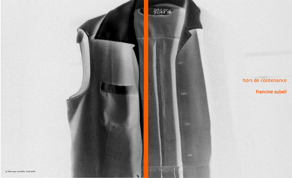Objet sensible. Hors de contenance est un objet sensible. Cet ouvrage de Francine Zubeil souvre et se clôt par des photos de vêtements sur un cintre prises dans lappartement de la mère défunte de lartiste. En son centre, lobjet bascule sur une dizaine de pages et ce sont des lignes dimmeubles situés au cur de Manhattan, où Francine Zubeil a été en résidence de création, qui envahissent lespace de la page. Lensemble est imprimé en négatif sur papier transparent. Le regard traverse les images, si bien que la perception se résout en dehors de luvre elle-même.