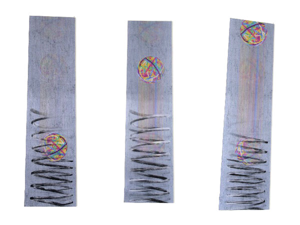 En effet, l'espace d'accueil destiné à recevoir le 1% est un lieu de passage entre deux bâtiments, petit avec peu d'espaces disponibles pour une intervention plastique. J'ai choisi d'utiliser des ressorts et des balles élastiques comme visuel des réalisations. Les ressorts et balles pour leur forme simple et presque abstraites et leur élasticité, contractions, extension ainsi que sur les rebonds et d'autres illusions de mouvements possibles avec ces objets.