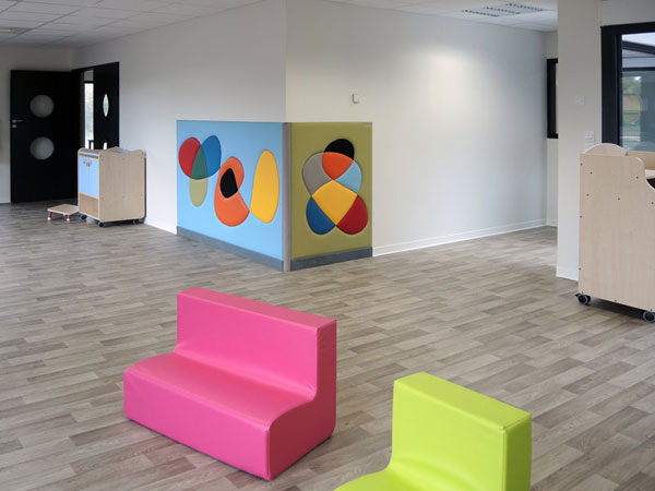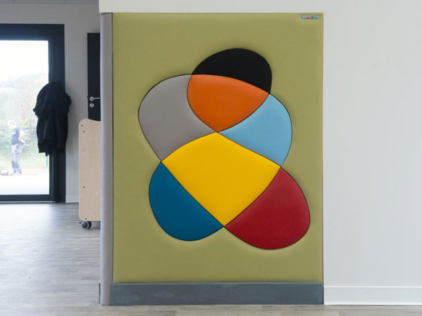 Une double cloison en angle, en matériau souple, est installée dans la pièce de vie à hauteur des petits enfants. Le tracé sur ces deux cloisons évoque un griboullis mural enfantin, et délimite des formes colorées qui sont autant de "pads" interactifs déclenchant des sons (parmi plus d'une centaine) selon une pseudo-logique déroutante. Les formes noires abritent les haut-parleurs. Par l'appui sur une des formes colorées, les enfants peuvent écouter un échantillonnage de paroles d'adultes de Livarot, impliqués ou non dans le projet du bâtiment. Tous se posent des questions ou expriment - de façon sérieuse ou cocasse - ce qu'ils envisagent indispensable pour le bien-être des petits usagers de ce nouveau bâtiment.