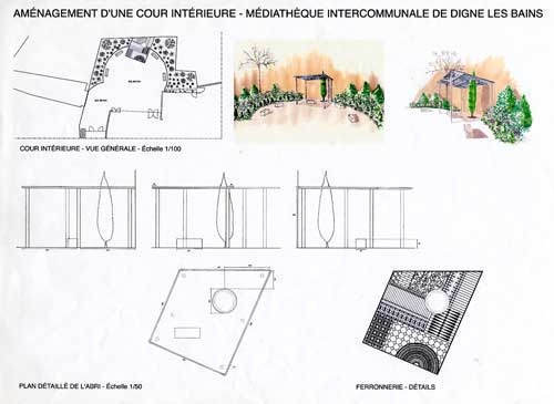 Texte d'intention Mon projet pour la médiathèque de Digne-les-Bains consiste à réaliser un environnement de repos dans la cour intérieure de la médiathèque. Cette installation, un abri réalisé en fer forgé, sera composée de différents styles de ferronnerie cohabitant entre eux. En partant de l'architecture réalisée par Monsieur Jérôme Voutier et notamment des deux murs en pierres du pays qui structurent l'espace et de la verrière centrale, l'abri que je souhaite réaliser répond à ces éléments constitutifs.
