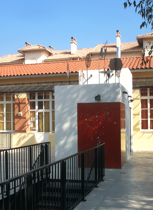 Cette oeuvre trouve son origine dans le nom même de l'école. D'emblée, l'appellation singulière de Révolution m'a paru devoir être l'axe principal de travail lors de l'élaboration de mon projet. Plus que la référence à l'Histoire de France, c'est un possible lien avec l'astronomie qui m'a intéressée : la question de la révolution terrestre. Mon travail et mes recherches se sont donc tournés vers Galilée à qui cette pièce fait directement référence. Outre le nom de l'école, la position de la construction à investir et son affectation sont entrés en ligne de compte dans mon travail. Tout d'abord, cela m'intéressait que ce module soit situé entre les deux cours. Sa position en fait un repère visuel fortement présent. Il émerge entre les deux espaces, visible des deux côtés, en point presque culminant de l'école, en tout cas point culminant de cet espace intérieur. Ces caractéristiques, couplées à sa fonction principale d'élévation se sont imposées pour fonder mon projet. Cette construction sera visible par les élèves de maternelle depuis leur cour de récréation, en levant les yeux vers l'école primaire. Les élèves de cette dernière auront eux le même type de point de vue, augmenté de la possibilité d'emprunter la coursive du premier étage et d'ainsi monter au niveau de la partie émergente du module. Ces deux modalités d'accés suggéraient l'idée d'un passage d'un lieu à un autre qui suppose de grandir : pour accéder au niveau 1 que l'on voit depuis la cour, il faut rentrer en primaire. Grandir donc, et ce, au sein d'une école, c'est à dire en ayant acquis des connaissances. Cette double exposition m'a guidée vers le désir d'investir le toit avec une pièce qui serait visible des deux côtés, de façon très légèrement différente, dans une continuité qui s'enrichit de détails lorsqu'on peut s'approcher de la pièce. Une intervention à cet endroit demandait alors, pour être vue, de lever les yeux vers le ciel, ce geste qu'a fait Galilée tant de fois pour décrypter et comprendre les formes, mouvements et organisations des planètes. Face aux croyances dogmatiques imposées par la religion il a su comprendre avec la rigueur de la logique scientifique, avec la curiosité et l'audace d'utiliser la science pour questionner les acquis du monde, un fonctionnement fondamental de l'univers parmi tant d'autres découvertes et avancées primordiales. Les girouettes que je propose d'installer sur le toit racontent ce geste à travers différents éléments empruntés pour partie aux travaux de Galilée ou qui évoquent les embûches rencontrées dans ses recherches.