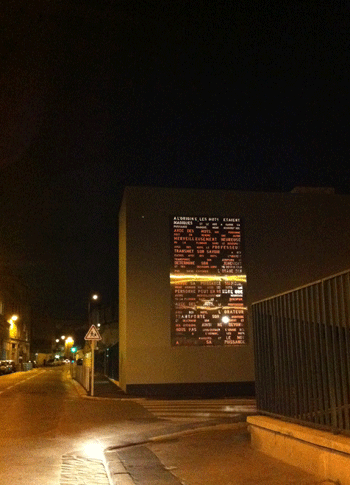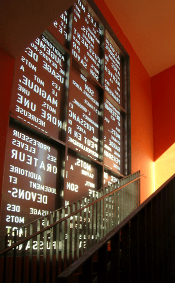 - La lecture purement visuelle de la pièce dans son intégralité. La phrase remplit la surface. Un jeu entre le vide et le plein se met en place, le regard saute d'un espace à l'autre, d'une lecture à l'autre.