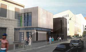 Elle vient en remplacement d'une grille prévue par les architectes et remplit complètement la fonction de fermeture et d'aération nécessaire au bâtiment. Une armature enprofilé sera mise en place dans cette ouverture et servira de support de fixation pour les neuf plaques d'inox de 3mm d'épaisseur.