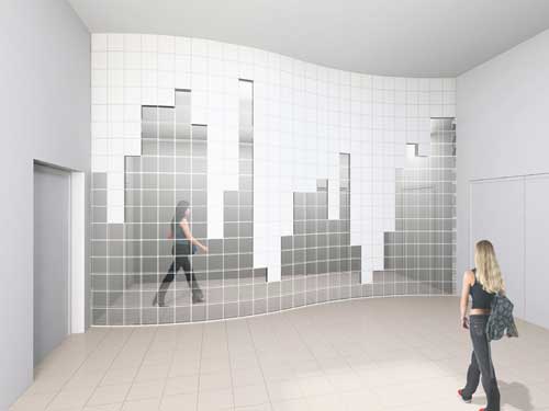 L'oeuvre que je vous propose dans le cadre du 1% artistique pour le futur gymnase du Lycée Jacques Monod s'intitule 'Fonte'., L'oeuvre est une paroi de verre qui sépare la première partie du hall comprenant la loge et un skydome de la seconde partie qui mène aux vestiaires. Ici, la paroi a pour but de diviser sans séparer la première partie du hall d'entrée de la seconde: l'oeuvre permet de relier deux espaces distinct et elle agit comme un mur partiellement transparent qui laisse entrevoir l'activité située de chaque côté de la paroi. La transparence du verre permet une interpénétration des espaces entre eux et une mise en mouvement de la paroi grâce au déplacement des spectateurs-acteurs. (...) Le verre a toujours été un matériau associé à l'idée de pureté et de clarté; il nous renvoie à la minéralité et à la fluidité de l'eau, mais aussi à la glace. L'oeuvre intitulée 'Fonte' utilise le matériau dans sa dimension la plus naturelle, sans artifices et sans effets superflus. L'association de briques de verre totalement transparentes et lisses avec d'autres blanches et opaques nous renvoie au dialogue du solide et du liquide, suggérant ainsi de la glace en train de fondre ou de l'eau qui se cristallise. Une tension est ainsi crée entre ces deux états de la matière (...) Mon oeuvre s'inspire à la fois du mouvement de fonte d'un glacier, des stalactites et des carottes glaciaires. La sobriété de la paroi nous suggère aussi un mur d'eau vibrant et en mouvement, une cascade baroque où le mouvement de l'eau est en même temps projection vers le haut et retombée. L'oeuvre projette également l'idée d'un paysage architectural en négatif, dessiné par les pavés transparents (lignes ascendantes) Le jeu des lignes verticales organise une image qui se développe horizontalement, suggérant ainsi les contours de bâtiments, d'un paysage montagneux ou d'un ensemble de glaciers perçus au niveau de la ligne d'horizon. (...) En lien avec les matières enseignées au Lycée technologique et professionnel Jacques Monod, l'oeuvre que je propose s'inspire également des schémas scientifiques et mathématiques tels un oscillogramme, un sismogramme ou un électrocardiogramme pour ne citer que ceux là. La persistance du trait sur le papier ou de la trace sur l'écran comme enregistrement d'un mouvement interne, caché, voire quasi imperceptible est un point de départ pour la compréhension du dessin constitutif de l'oeuvre en briques de verre. Le mouvement imprimé par l'organisation des briques de verre transparentes et opaques est à la fois ascendant et descendant suivant la mise au point du regard pour percevoir l'oeuvre et ce qu'elle dévoile ou occulte des deux espaces. Cette inscription de deux mouvements opposés et contradictoires est une donnée importante sur laquelle ma démarche artistique se fonde. Dans 'Fonte', nous voyons une suite de lignes verticales blanches et opaques ou transparentes qui oscillent dans un mouvement perpétuel et continue et qui s'étend même au-delà des dimensions de la paroi si l'on fait l'effort d'être attentif à ce qui se joue à l'intérieur de l'oeuvre. Ce mouvement infini suggéré par le dessin est également présent dans le mouvement courbe de la paroi de verre: vue de dessus, il s'agit d'une ligne sinusoïdale qui représente et signifie un mouvement infini et continu dans l'espace et dans le temps. Par ailleurs, la brique de verre utilisée pour la réalisation de la paroi fait figure d'unité de mesure qui sert à construire l'oeuvre un peu à la manière d'un agencement de molécules qui construisent une forme, une entité visuelle (...) Le motif de construction de l'oeuvre est la grille, forte présence dans l'histoire de la peinture et élément qui apparaît souvent dans mon travail plastique et également dans la façon d'accrocher mes oeuvres lors d'expositions individuelles ou collectives. La rigueur formelle de la grille induit paradoxalement une grande liberté d'expression. La liberté se gagne dans la contrainte.