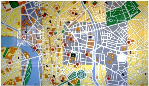 «Vous n'êtes pas ici» est une composition de 28 panneaux de plexiglass, destinée à être installée sur une portion de mur cylindrique du bâtiment E4 de l'université Paul Sabatier à Toulouse. Les 28 panneaux de 46 cm X 46 cm, suffisamment souples pour épouser la courbe du mur, sont peints à l'envers, sur la face posée contre le mur. Ce projet prend appui sur la fonction du bâtiment pour lequel il est conçu, à savoir, un centre d'orientation et d'information au sein de l'université et, avec humour et distance, sur la situation géographique de l'université, un peu éloignée du centre ville. Sur le plan de Toulouse, dont la mise en couleur révèle très discrètement le mot ICI, en jaune, les places du centre ville, animées et généralement très fréquentées par les étudiants, sont pointées par un logo rouge «vous n'êtes pas ici», se référant directement aux points de repérage généralement utilisés sur les plans d'information. Le plexiglass est utilisé pour sa surface brillante, mais aussi pour l'effet glacis que son épaisseur procure à la peinture... donner une picturalité à une image aussi informative qu'un plan de ville. Sandrine Raquin