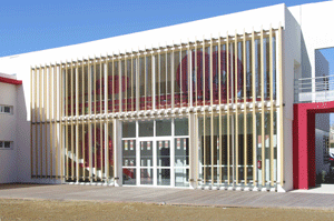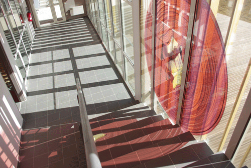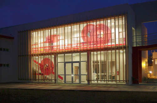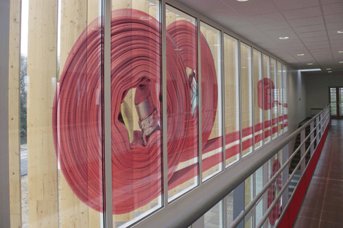 L'endroit prévu par l'architecte pour l'intervention artistique est une grande façade vitrée de 12m x 6,60m. Il s'agit de la façade d'un bâtiment qui abrite la caféteria, la salle polyvalente, les chambres etc. et qui constitue donc le lieu de vie des pompiers.