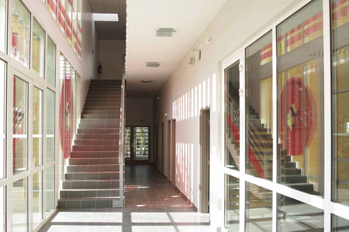 Coté intérieur de cette façade se trouve un espace de circulation qui lie le rez-de-chaussée par un escalier au premier étage. Une porte d'entrée s'ouvre sur la terrasse de la caféteria et un jardin. L'espace d'entrée à l'intérieur est peu profond, mais ouvert sur les deux étages, une galérie se situant au premier étage.