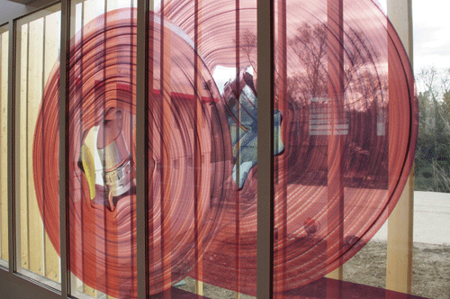 L'image même est translucide, transparente. Son apparence change avec les différentes situations de lumières. Vu de l'intérieur la lumière de jour l'éclaire, l'image se superpose à celle du jardin, la nuit elle s'efface prèsque. Vue de l'extérieur elle sera lisible au moment qu'elle sera directement exposée au soleil (exposition Est), et en même temps elle jetera son ombre de lumiére rouge sur les murs blancs de l'entrée. Le soir et la nuit toute la façade prendra l'aspect d'une grande caisse lumineuse.
