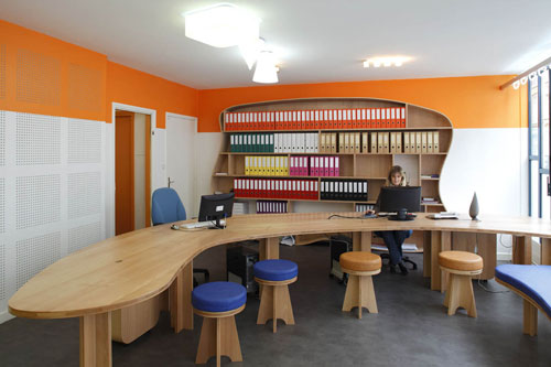 Le mobilier est lui, de construction simple et visible en éléments de contreplaqué 3 plis en hêtre de belle qualité, à l'usage de ceux et celles qui travaillent dans ce lieu ; et aussi à l'usage de ceux et celles qui y sont accueillis. J'ai voulu un mobilier chaud et enrobant et qui laisse une certaine fluidité à l'espace.