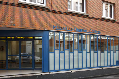 Faciliter le passage de la lumière du jour par une grande baie donnant sur l'extérieur, constituée d'un jeu des verres transparents et semi transparents, selon un dessin de panneaux verticaux qui évoque l' idée d'une fabrique, ou comme un petit atelier. Le nom de la maison de quartier apparaît au-dessus de la façade en lettres de métal peint.