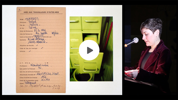 | Dalila Mahdjoub reste au plus près d'une économie du geste pour parler de l'histoire coloniale entre la France et l'Algérie dont elle fait littéralement « tomber » le langage. Elle renouvelle et continue ici une approche biographique, esthétique et historique, entrecroisant plusieurs pistes. En plus de la dimension biographique dans son oeuvre (l'histoire de son père, travailleur algérien immigré, ouvrier chez Peugeot à Sochaux, et dont le document officiel de naturalisation française a été adressé à la famille après sa mort ; sa soeur aînée, Romilla, morte en bas âge juste avant que ses parents ne partent en France ; des archives de l'A.T.O.M., aide aux travailleurs d'outre-mer), Dalila Mahdjoub nous parle de l'état du monde et des autres, du service des étrangers malades à la préfecture de Marseille ; de la dernière page du roman de Michel Houellebecq, Soumission ; de la cabane du ministère du travail et de la sécurité sociale qui se trouvait au pied de l'enceinte actuelle du Mucem. Une grande part de la proposition de Dalila Mahjoub a été au centre de l'édition Romilla (Éditions commune, 2019).