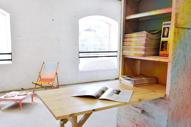 | Diego Guglieri Don Vito, L’assemblée heureuse, commence à se frôler, 2022 Dimensions variables, œuvre / dispositif, caisse de transport, paravent, chaises longues, table basse, peinture acrylique pulvérisée Crédit photo : Diego Guglieri Don Vito |